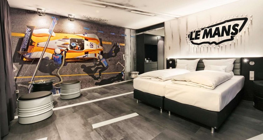 La peculiarità però sta nelle camere che sono tematiche e dove si dorme in letti allestiti con pezzi di carrozzerie di auto celebri come ad esempio la Mercedes per la suite omonima, nell’ex torre di controllo dell’aeroporto, una Jaguar per la camera British Rancing, la BMW E36 per la camera Liqui Moly, dal nome di un olio per motori, ovviamente tedesco, una Citroen DS per la stanza Vive la France oppure  un’Alfa Romeo vintage per la camera Forza Italia.