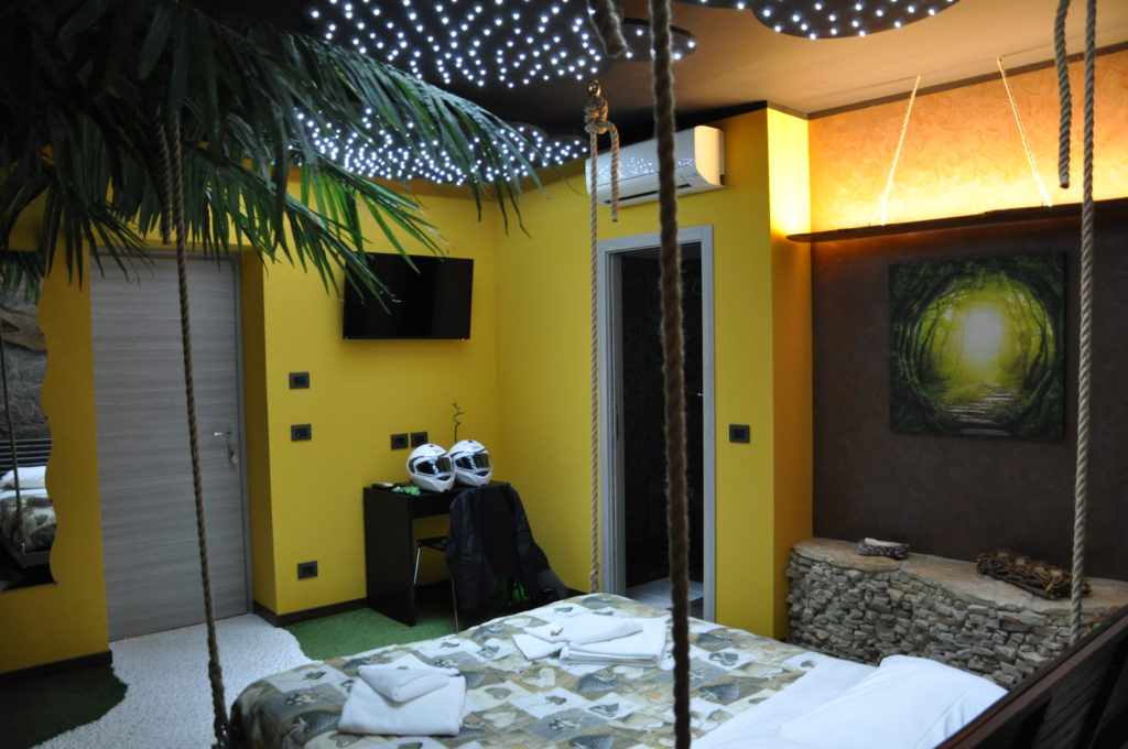 La nostra stanza ad esempio era in vero stile wild, aveva il letto sospeso perché era appeso al soffitto, ampio bagno, gioco di luci a led come cielo stellato, filodiffusione della musica con bluetooth, palma gigante, erba sintetica che circonda i sentieri lungo la camera.