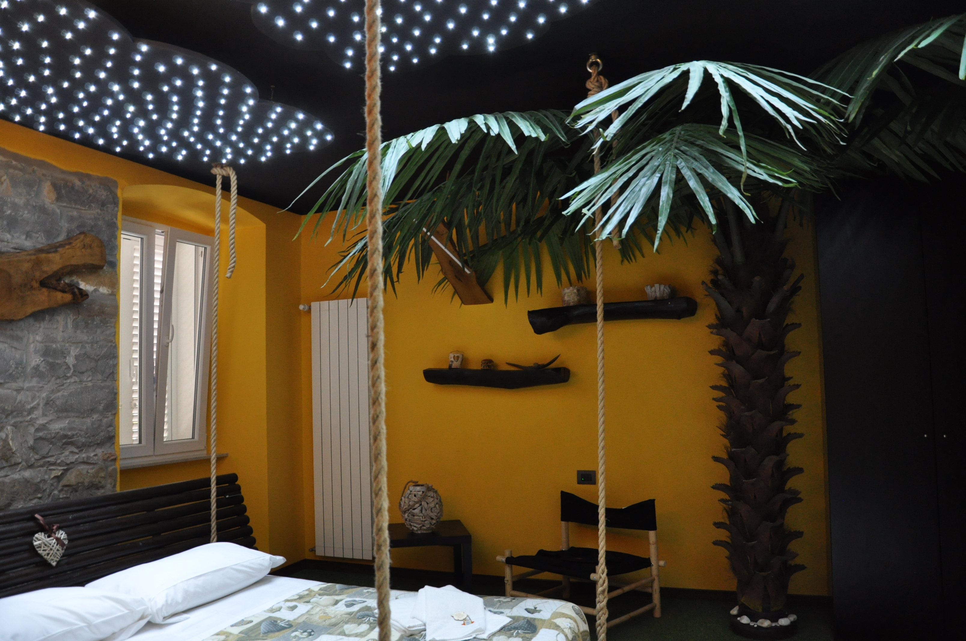 La nostra stanza ad esempio era in vero stile wild, aveva il letto sospeso perché era appeso al soffitto, ampio bagno, gioco di luci a led come cielo stellato, filodiffusione della musica con bluetooth, palma gigante, erba sintetica che circonda i sentieri lungo la camera.